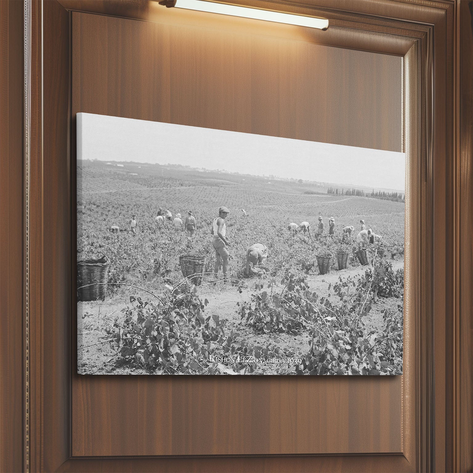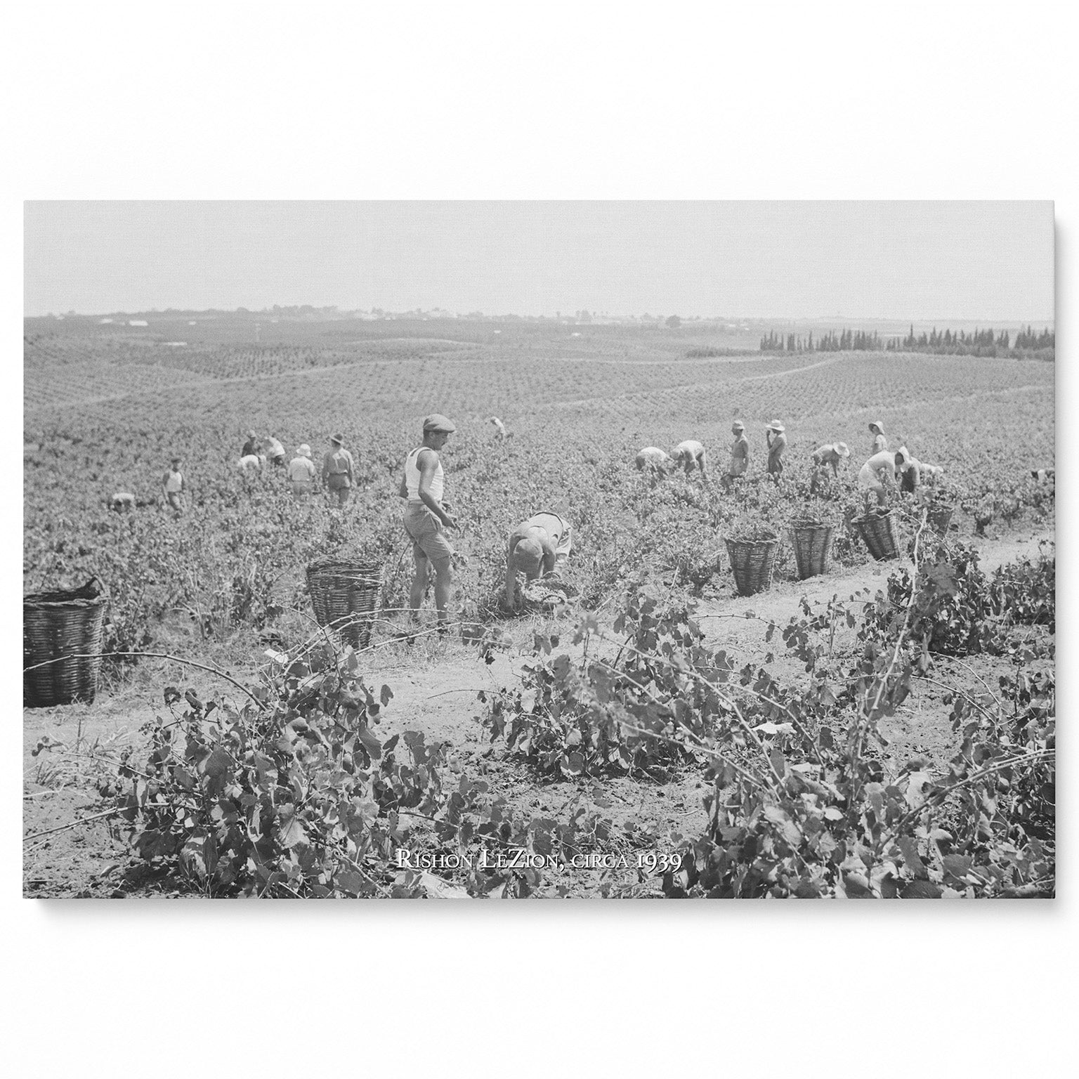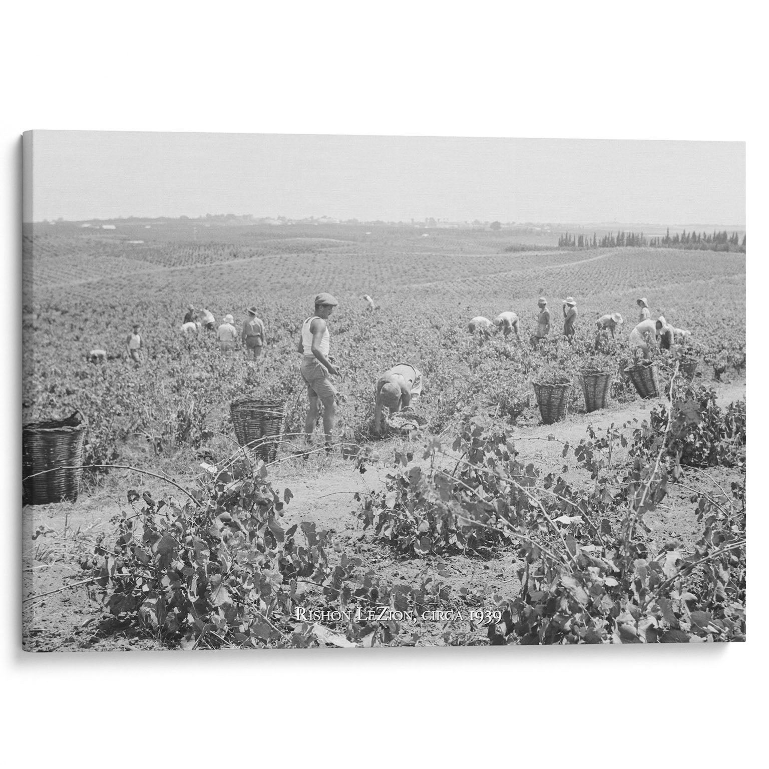 Celebrate the promises of God coming to pass with this gorgeous "Harvest in the Vineyard" Gallery Wrapped Canvas. This historic black and white photograph captures Jewish pioneers picking grapes during the autumn harvest, and illustrates the bounty of the Promised Land.