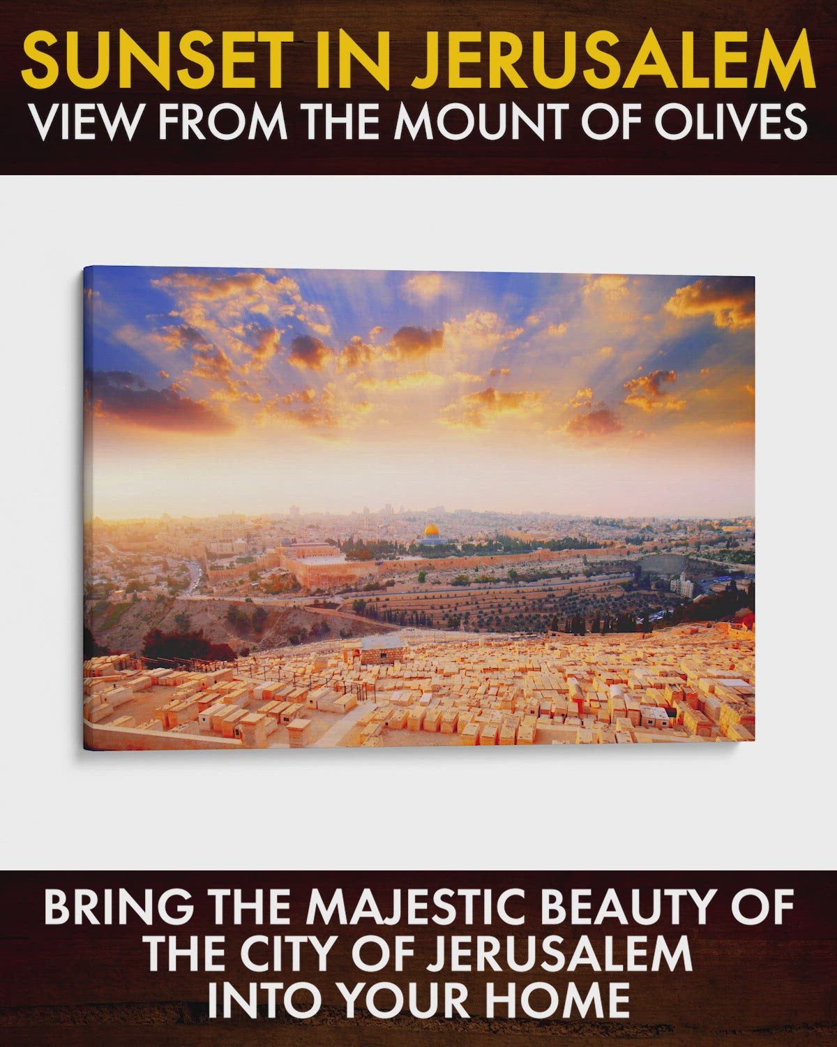 • Photographed at sunset from the peak of the Mount of Olives, this large art features a panoramic view of the Old City of Jerusalem with Mount Zion at its center.