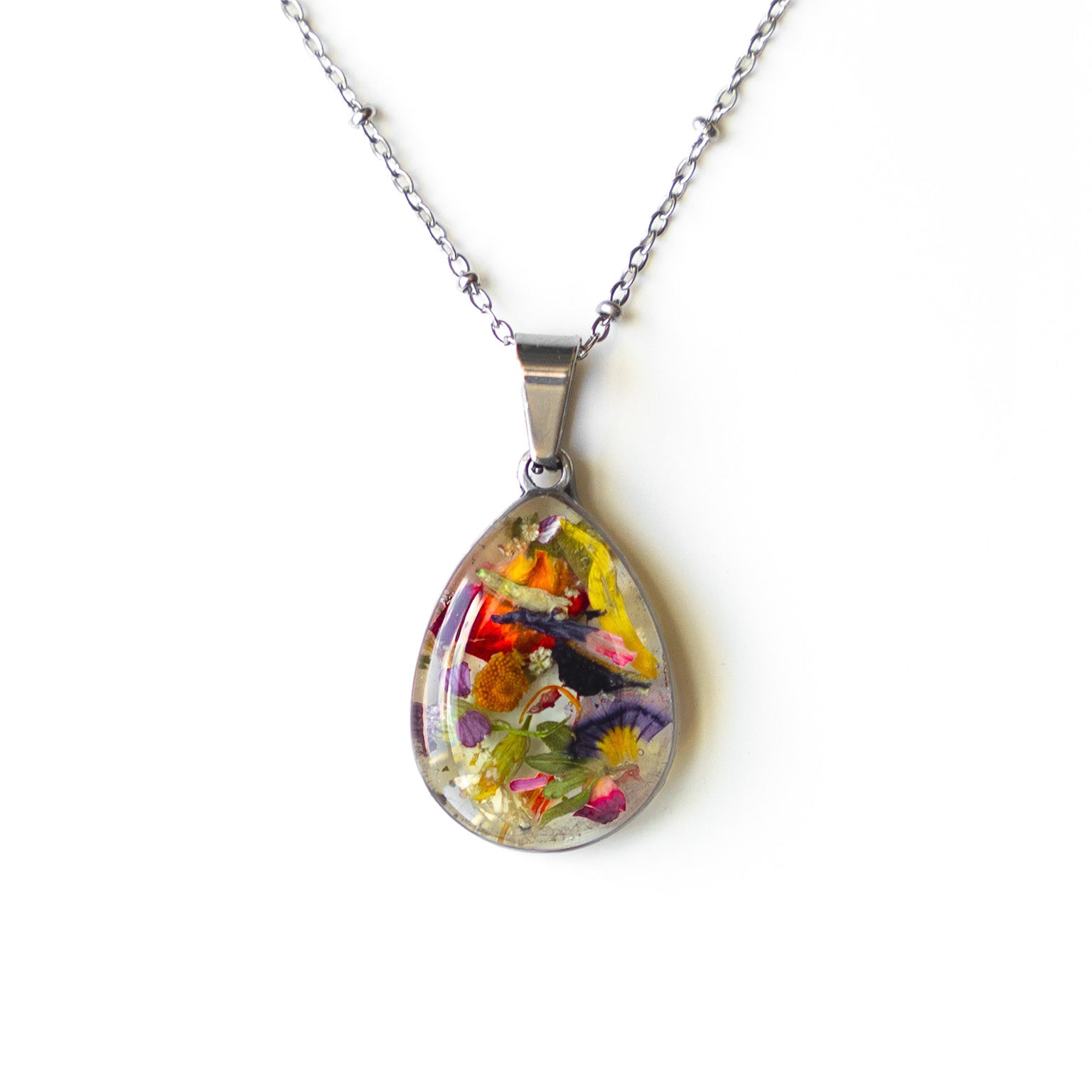 The pendant and chain are made entirely of long-lasting stainless steel. This silver hue complements the flowers perfectly, adding a touch of timeless sophistication and luxury to the necklace.