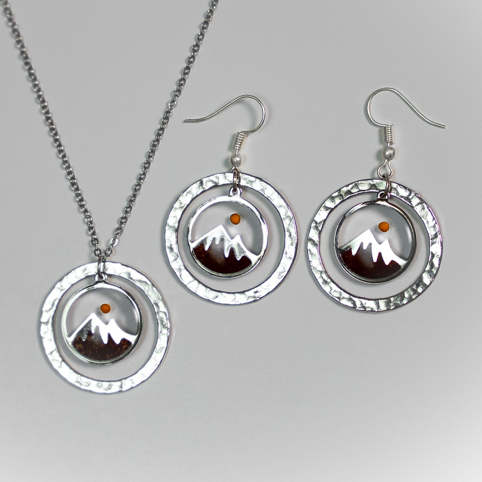 Skillfully handcrafted, this one-of-a-kind necklace and earrings set contains soil from the Mountains of Jerusalem and a mustard seed sourced from Bethlehem.