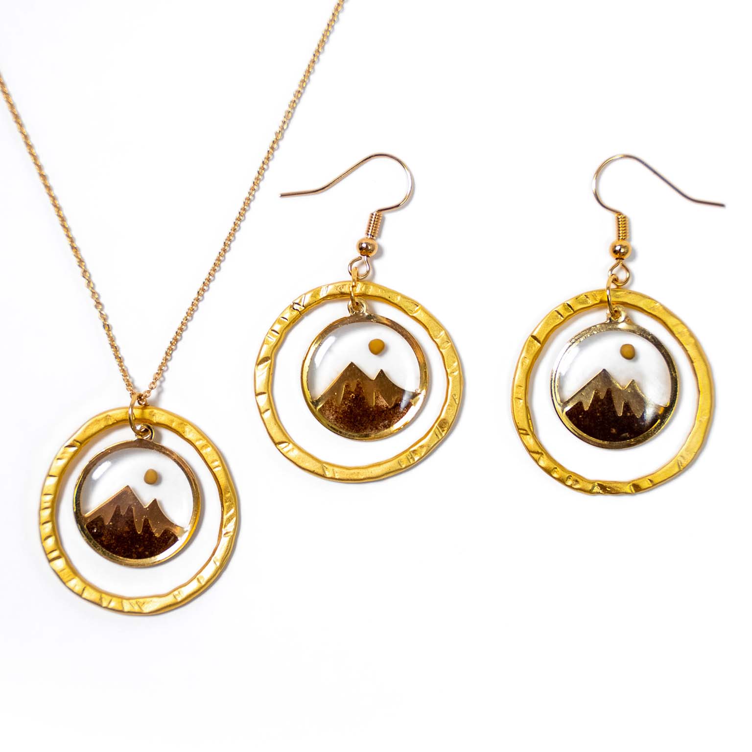 Skillfully handcrafted, this one-of-a-kind necklace and earrings set contains soil from the Mountains of Jerusalem and a mustard seed sourced from Bethlehem.