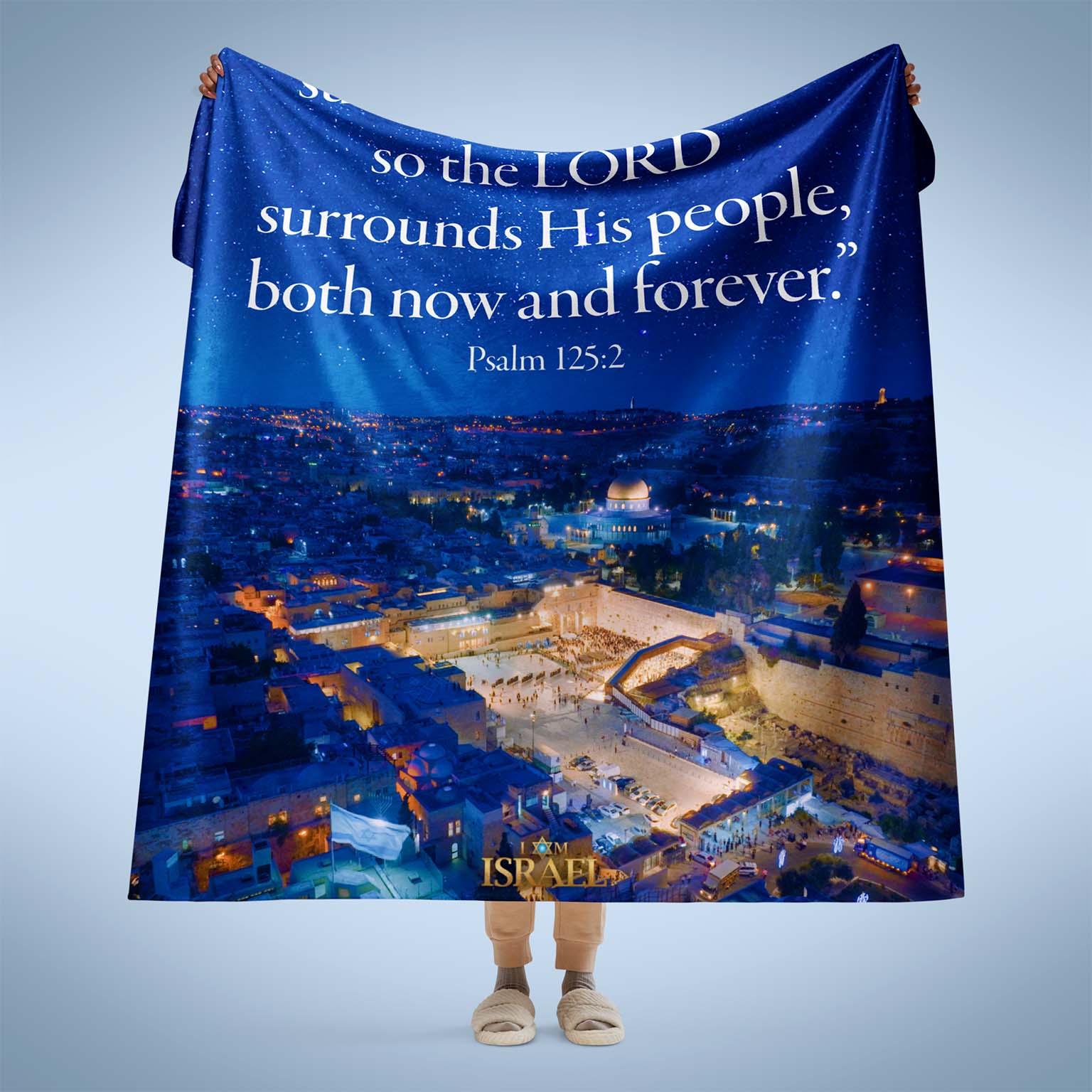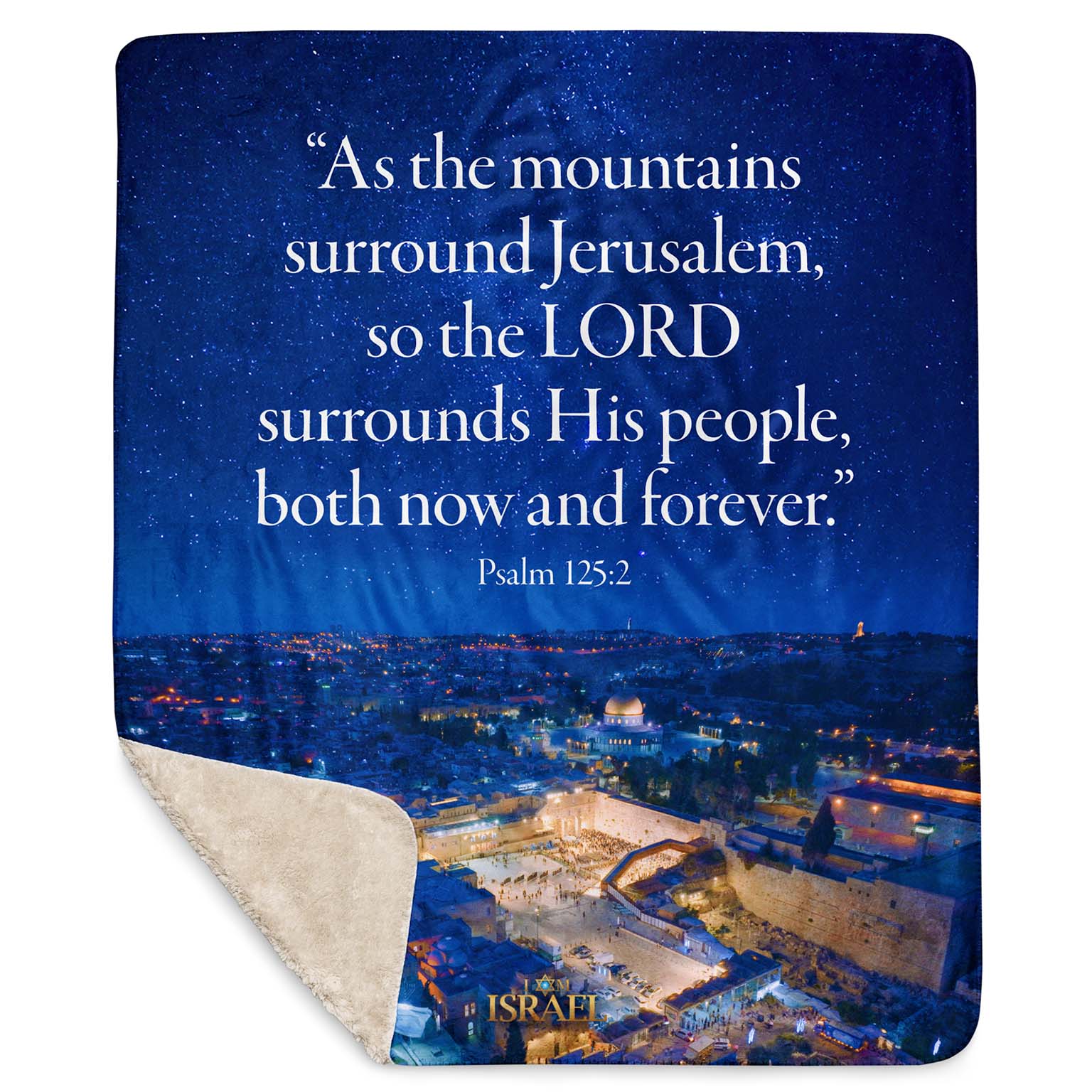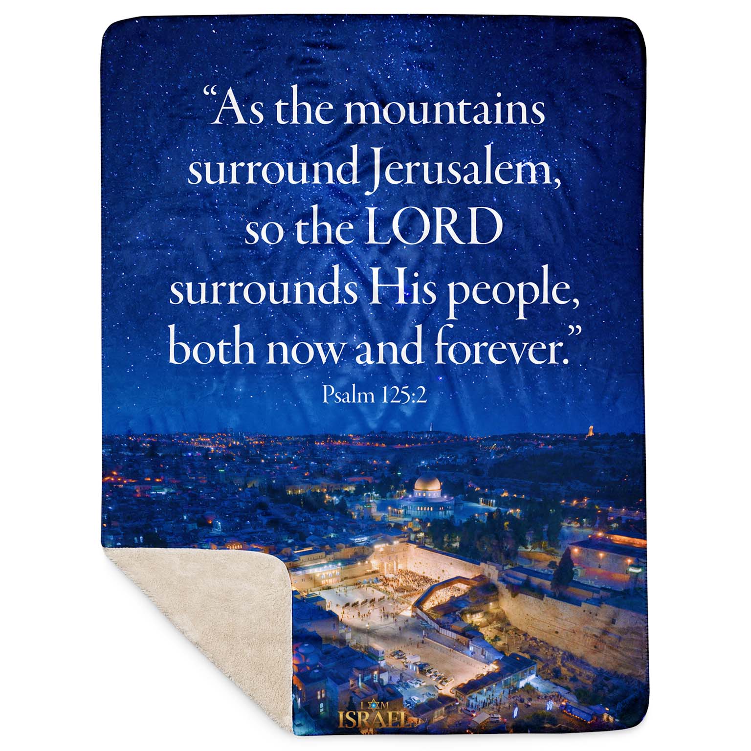 Wrap yourself in the promise of God’s protection with this luxuriously soft Sherpa blanket. Featuring a breathtaking starry-night view of Jerusalem and the timeless words of Psalm 125, this blanket is a gentle reminder of the LORD who surrounds His people “both now and forever.”