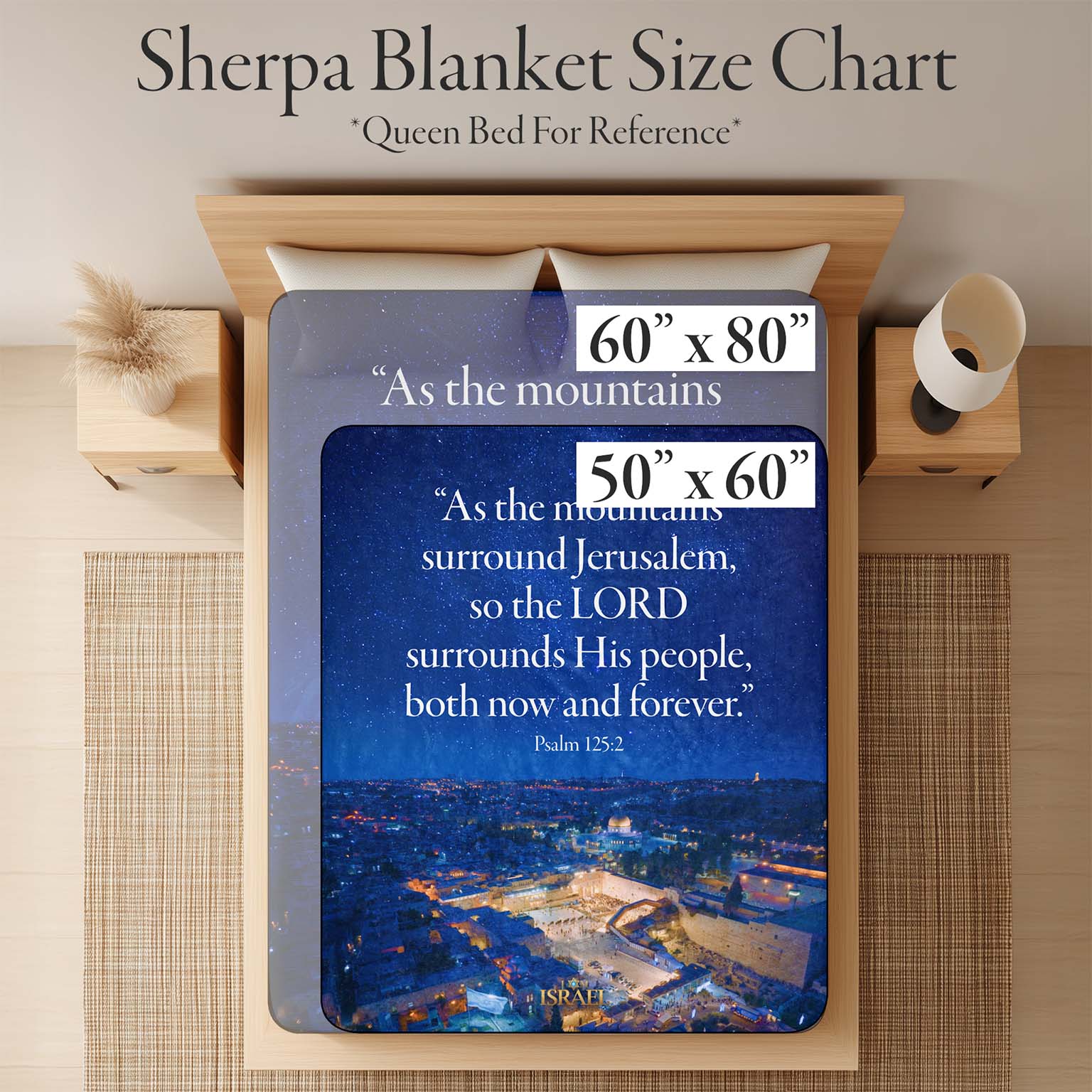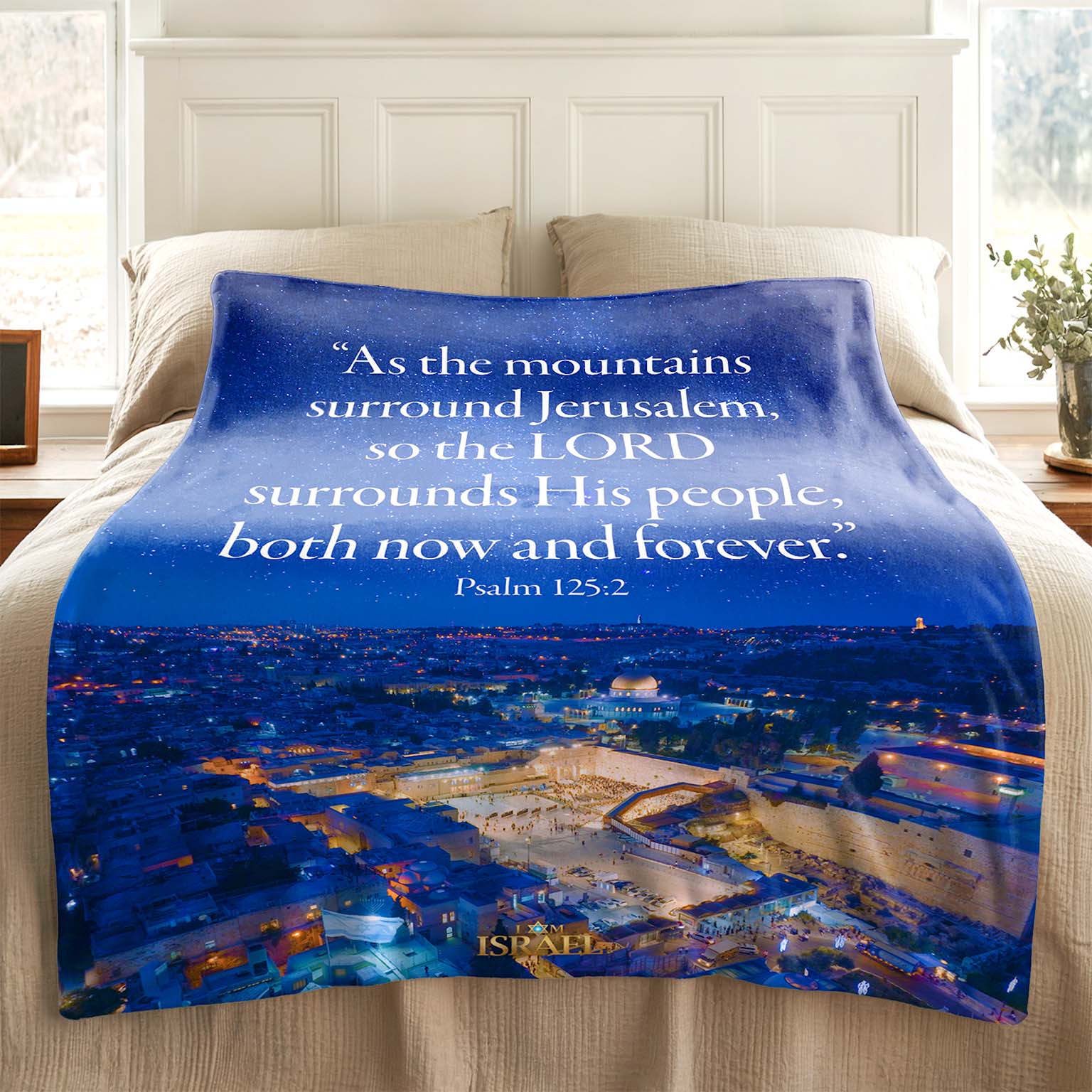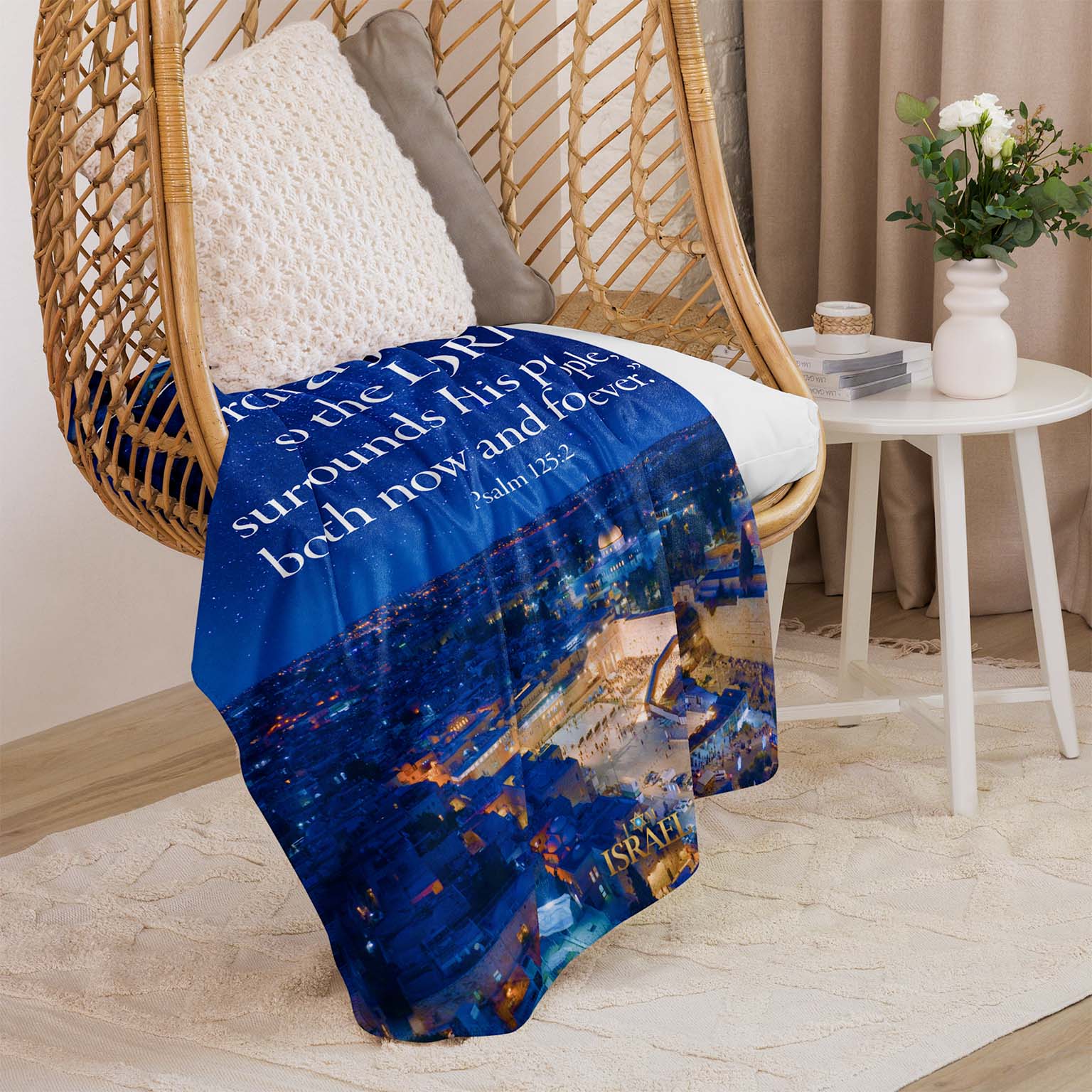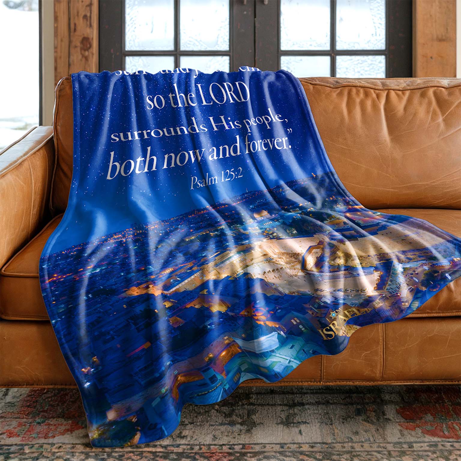 Wrap yourself in the promise of God’s protection with this luxuriously soft Sherpa blanket. Featuring a breathtaking starry-night view of Jerusalem and the timeless words of Psalm 125, this blanket is a gentle reminder of the LORD who surrounds His people “both now and forever.”
